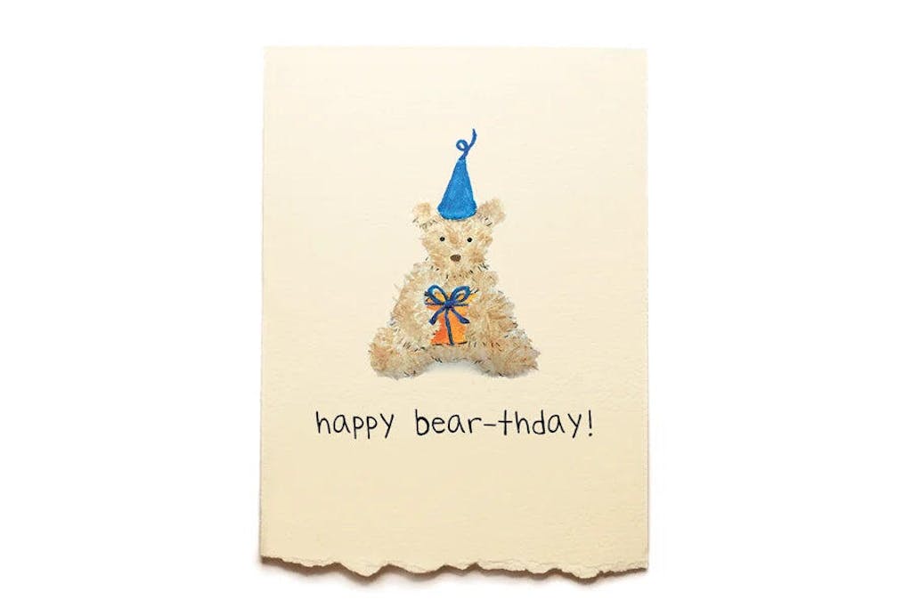 Greeting card with a teddy bear wearing a party hat and bow tie, and text 'happy bear-thday!' on a beige background.
